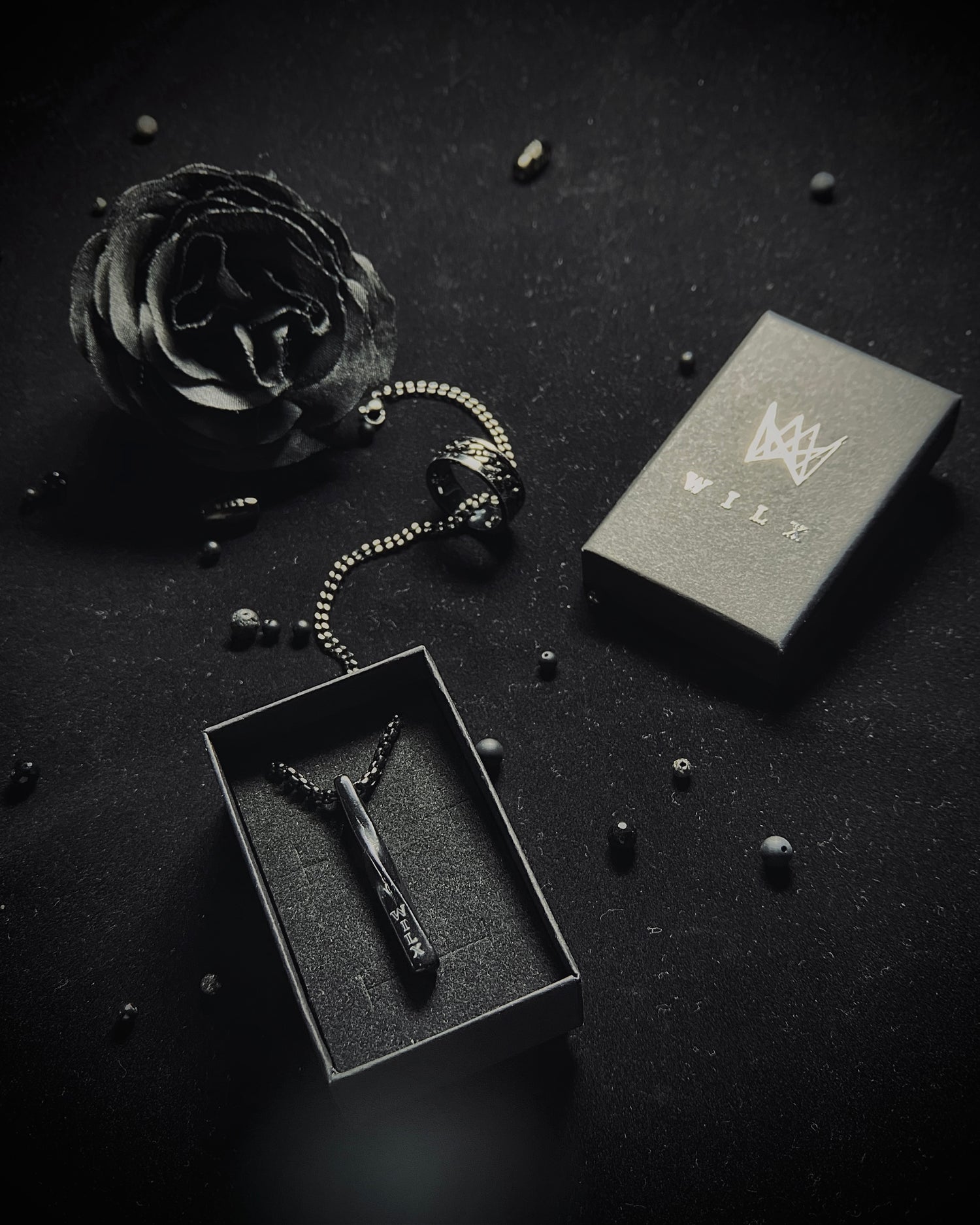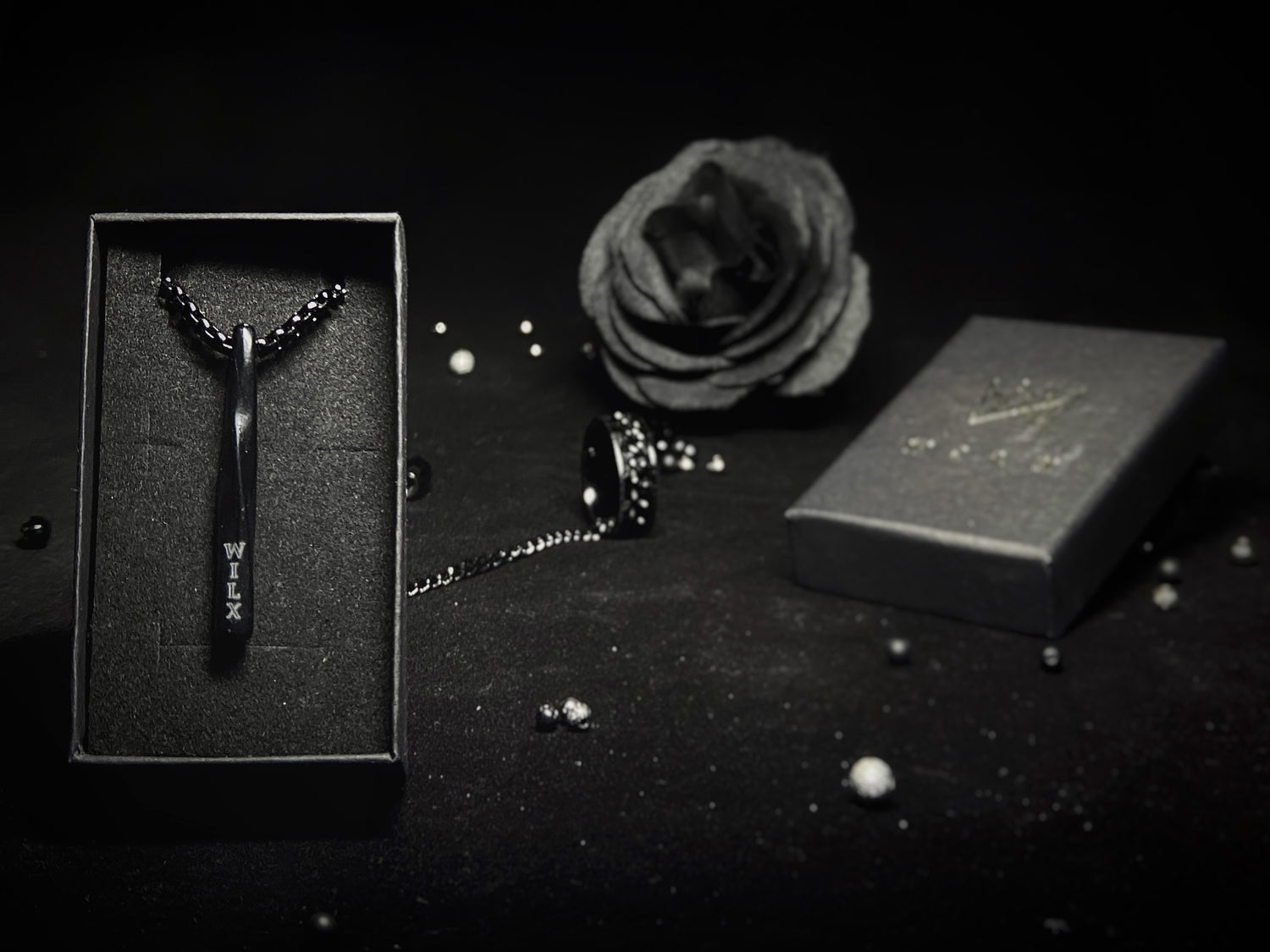 שרשרת בצבע כסף, בסגנון מלבן מפותל עם קצבות עגולות יחד עם חריטה עדינה של אותיות שם המותג - W I L X.
